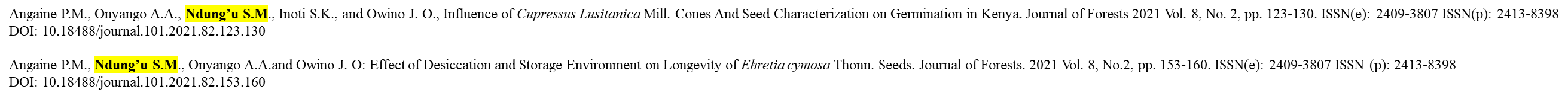 Ndung’u S.M., Kimiti J.M.: Effect of Moisture Content and Temperature on Viability and Longevity of Cordia Sinensis Lam. Seeds in Journal of Resources Development and Management. An International Peer-reviewed Journal Vol.28, 2017 Angaine P.M., Onyango A.A., Ndung’u S.M., Inoti S.K., and Owino J. O., Influence of Cupressus Lusitanica Mill. Cones And Seed Characterization on Germination in Kenya. Journal of Forests 2021 Vol. 8, No. 2, pp. 123-130. ISSN(e): 2409-3807 ISSN(p): 2413-8398 DOI: 10.18488/journal.101.2021.82.123.130